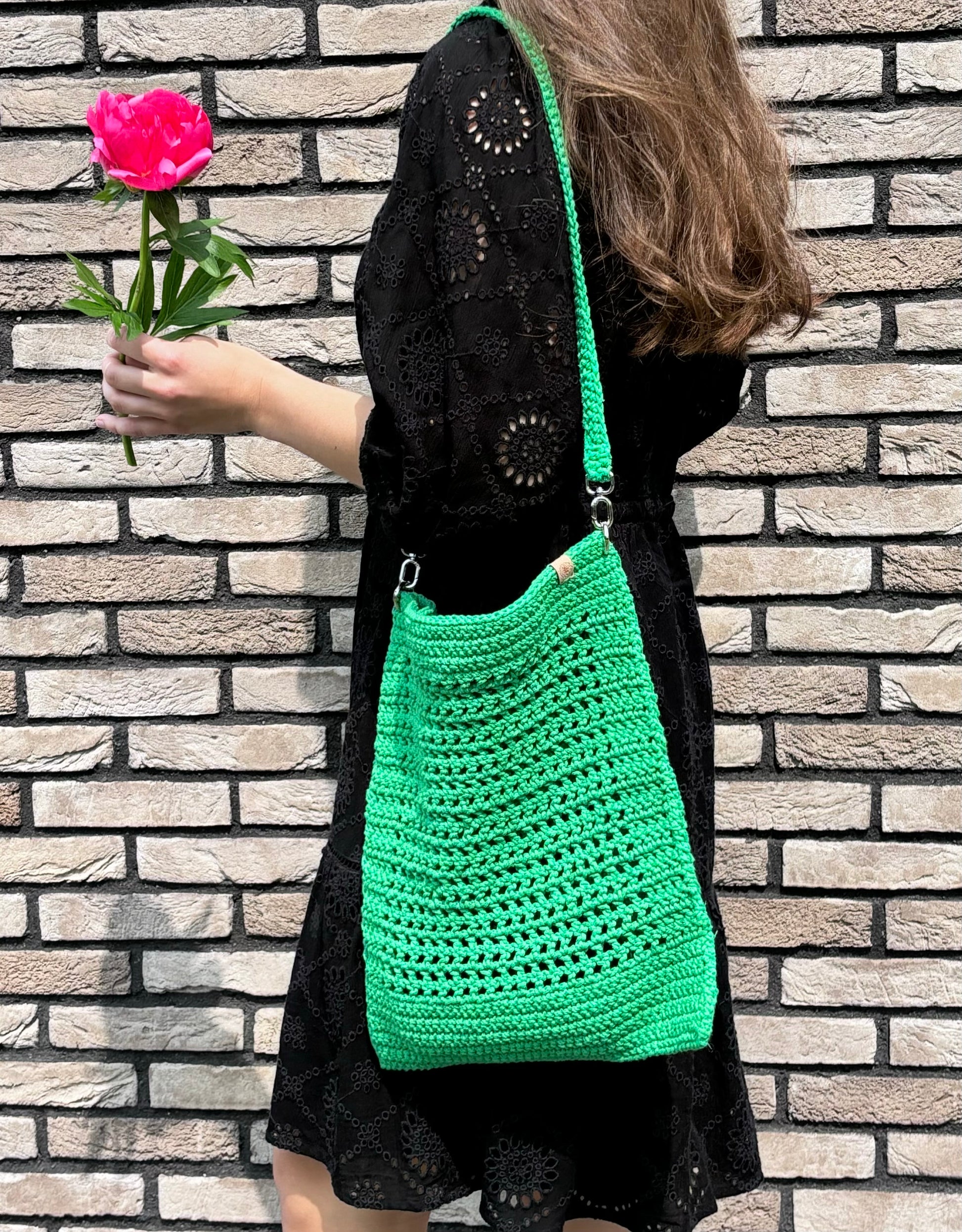 Kunti studijos kūrėjų, rankomis nerta rankinė. Lengvai telpa kasdieniai daiktai – knyga, akiniai..